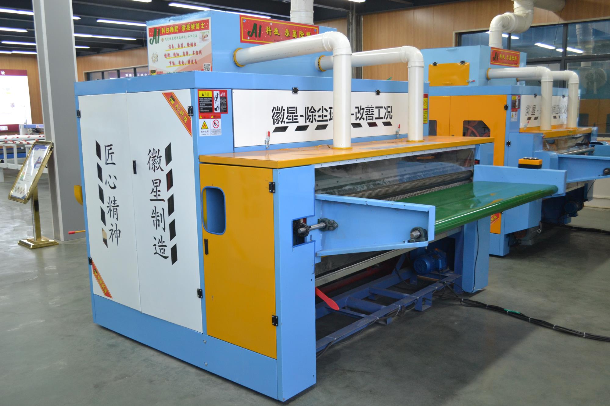 產(chǎn)品簡介:彈花梳理一體機高配款,可對棉被寬度自由調(diào)節(jié),為對用戶的生產(chǎn)帶來了方便,大功率排風(fēng)機,高效的吸除落棉、飛花和粉塵的裝置改善了勞動環(huán)境減少了紗疵該機排雜性能良好。彈花梳理一體機高配款已向優(yōu)質(zhì)、高產(chǎn)、低耗的方向發(fā)展,機流程簡單易學(xué),分體控制柜,按鍵一鍵啟動,雙側(cè)羅拉采用全封閉設(shè)計,防纏繞,不塞棉,不藏灰,低噪音,錫林工作輥采用上市公司原材,該機可隔機安全觀察,開松四羅拉不抽花,雙雜亂。它配有雙吸塵系統(tǒng),除去棉花中的粉塵以及短絨,同時改善了工作環(huán)境。該機可對各種纖維、棉花、羊毛、駝絨、等原料開松梳理,是生產(chǎn)棉被、羊絨被、絲綿被的機械。